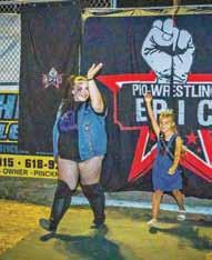 Left: 2023 Little Miss Perry County Fair Queen Tennyson Logan waves to the crowd as she escorts Riley Knocks to the ring for her match against Thunderkitty for the PWE women’s championship. Photo courtesy of PWE.