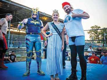 Above: The Solution members Leone Mephisto (foreground) and Nick Natural make their entrance during Faircade. Photo by Jared Shannon. Below: Benjamin “The Jet” Trust and Perry County Fair Public Relations Coordinator (and All American Announcer) Pete Spitler pose for a photo on the Midway. Photo by Justin Parmley.