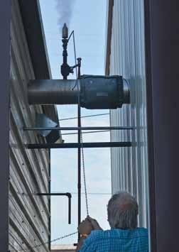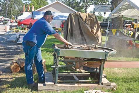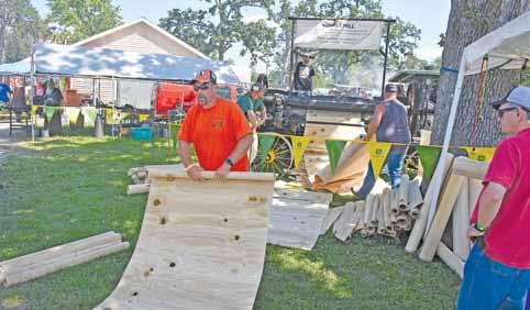 The St. Joseph Iron Works Veneer Mill, donated to the American Thresherman Association by the family of Edwin Eddleman is hard at work. This mill came out of a basket factory in the Cobden area. The veneer was originally used to make strawberry and other larger baskets for the orchards. The veneer milling demonstrations will take place daily beginning at 11:00 a.m. and 2:45 p.m. Above: Jonathan Kujawa, of Tamaroa, rolls up a section of soft wood created by the veneer mill behind him. Veneer mills were used to make fruit baskets for orchards.