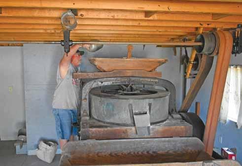 Above: Mark Herberlie of St. Genevieve, Missouri, runs the grist mill demonstration last year during the American Thresherman Association’s show. They make fresh whole wheat flour that is stone ground everyday. The grist mill was newly opened in 2019.