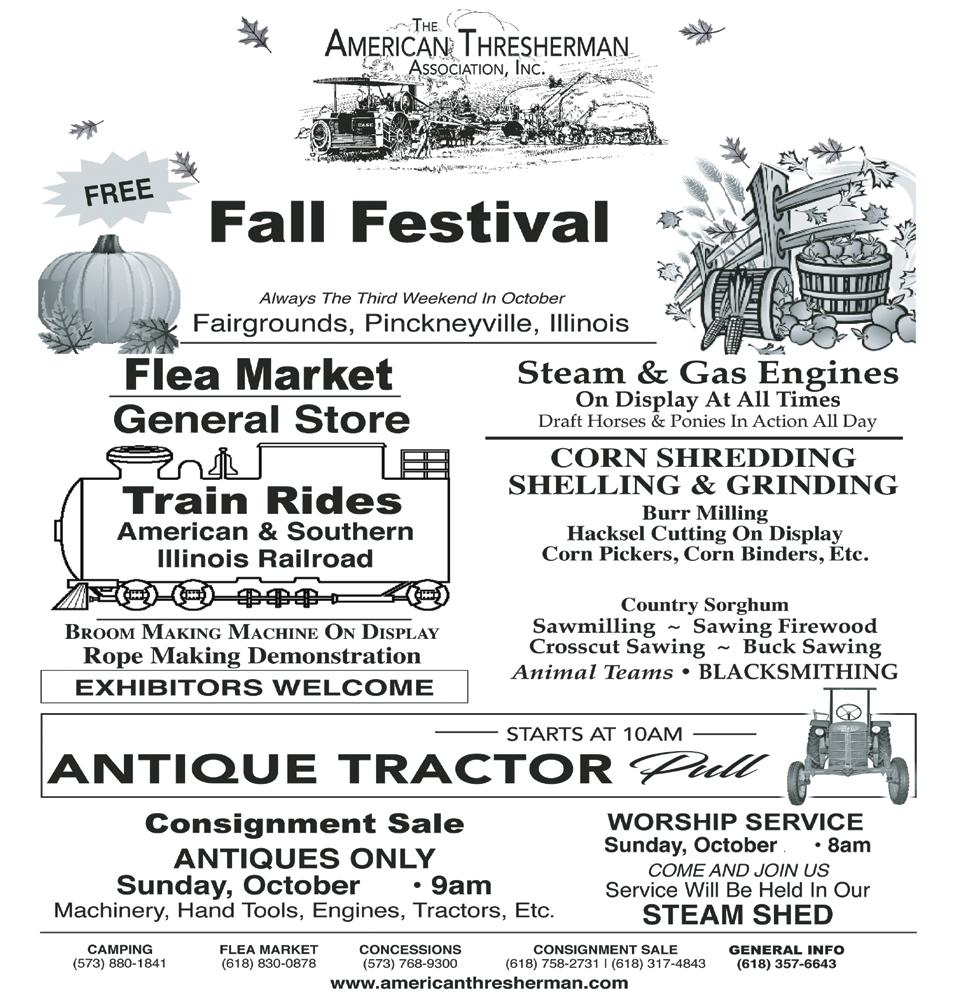 The American Thresherman Association’s 38th Annual Fall Festival kicks off on October 18th and continues throughout the 20th at the Fairgrounds in Pinckneyville.