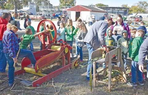 Above Left: Pinckneyville District 50 students make rope during their visit to the American Thresherman Association’s Fall Show on October 14, 2022. Above Right: A group of kindergartners from Pinckneyville Community High School’s class shuck corn.