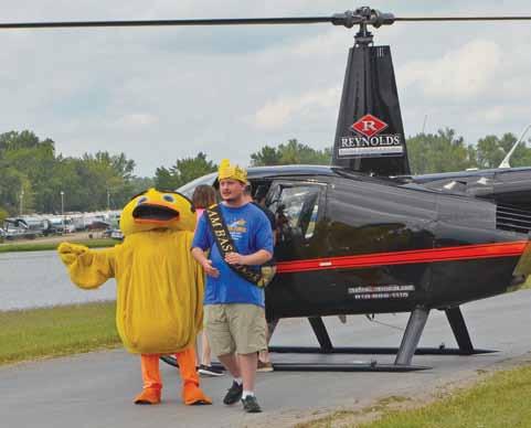 Above: Duck Ambassador Jack Langley and the Ducky Derby’s mascot, Splash, exit their helicopter and make their way to the derby’s opening ceremony.