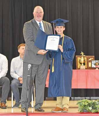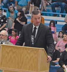 Above Left: Dylan Brammeier walks toward his seat as the graduation ceremony begins. Above Center: Laban McConachie gets a hug from his mother, Pinckneyville Elementary School principal and PJHS Athletic Director Brittany McConachie. Above Right: Laban McConachie is presented with the Most Outstanding Student Award by Kyle Smith. Below: PJHS Principal Mark Rohlfing delivers remarks.