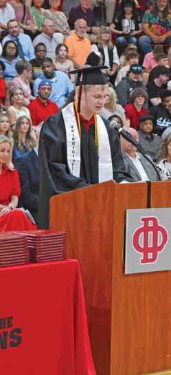 Left: Distinguished Yearbook Award winners Reese DeHart and Gannyn Funk. Above Left: DMS graduate Reese DeHart delivers the Class of 2024 farewell. Above Right: DMS graduate Oakley Jones goes through the handshake line.