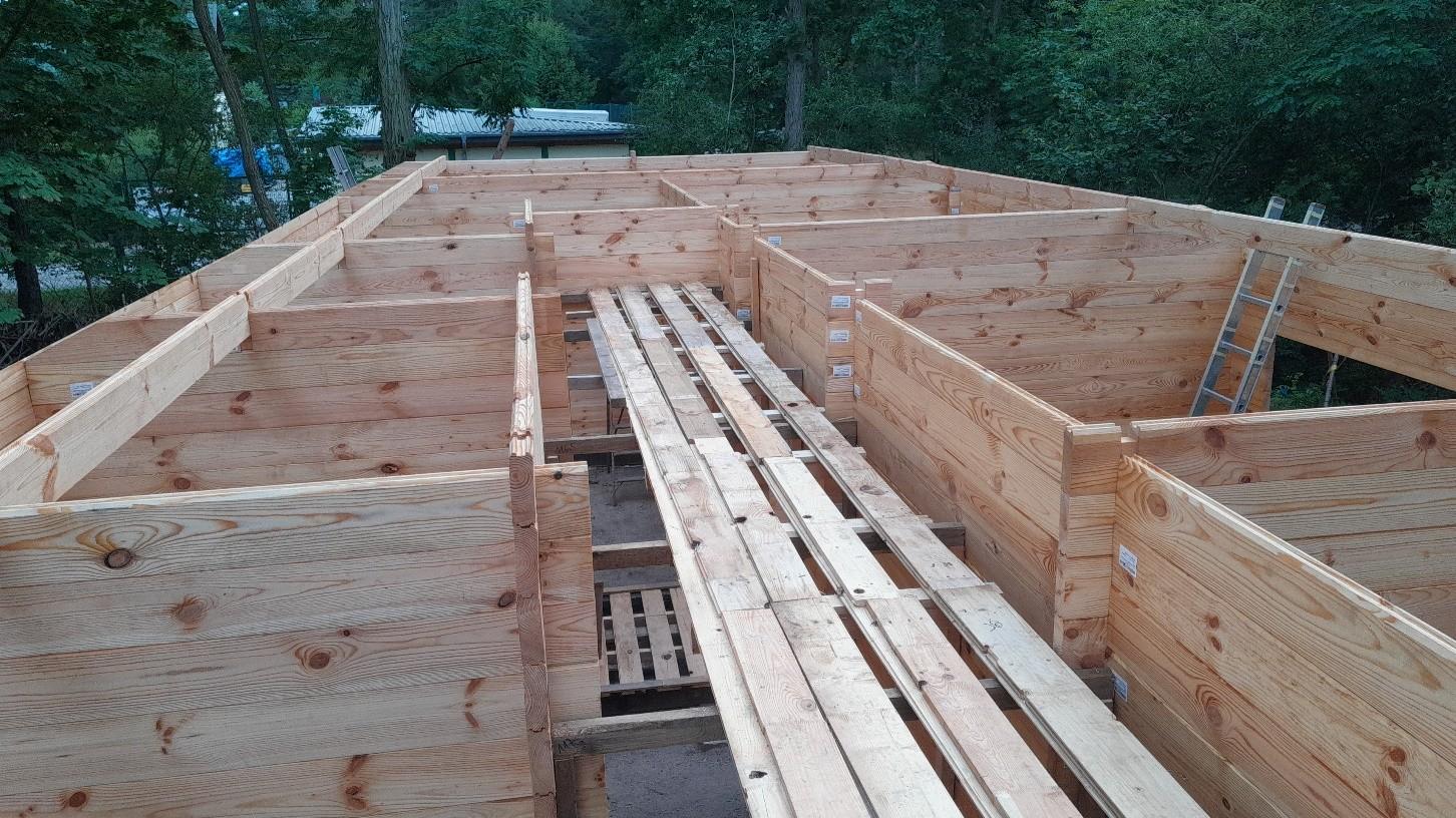 Im Mai 2020 war es dann endlich soweit, die isolierte Bodenplatte war fertiggestellt und unsere Emma wurde per Spedition geliefert. Da wir viele Handwerker und einen Architekt in der Familie haben war klar, dass wir unser Haus selbst aufbauen. Das gelieferte Holz wurde sortiert und dann konnte es auch schon losgehen. Unser Aufbau Team bestand aus 6 Personen und der Aufbau hat uns allen sehr viel Spaß gemacht. Es erinnert ein wenig an „Lego bauen“ und bereits am 4. Tag stand unsere Emma ( ohne Dach ) auch schon im Garten.