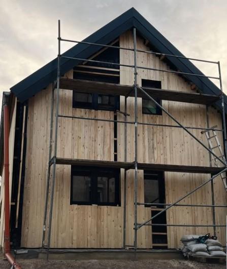 „Als Anmerkung, es ist schwierig die Dachlattung zu montieren ohne Kehlbalken. Da musste ich von innen im Flur noch mal alles verblenden. Ansonsten bin ich zufrieden, die Fenster sind top, das Zubehör auch, einige Balken waren verzogen, mal schauen wie es aussieht, wenn sich das alles gesetzt hat. Zum Abschluss gab es doch noch ein kleineres Problem mit der Materialmenge aber nach einigem hin und her konnten wir uns auch hier einigen und wir sind nun zufrieden. Wir haben Pineca schon mehrfach weiterempfohlen.“