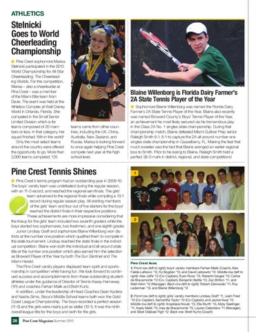 Pine Crest Tennis Shines n Pine Crest’s tennis program had an outstanding year in 2009-10. The boys’ varsity team was undefeated during the regular season, with an 11-0 record, and reached the regional semifinals. The girls’ team advanced to the regional finals while compiling a 10-1 record during regular season play. All starting members of the girls’ team and four out of five starters for the boys’ reached the district finals in their respective positions. These achievements are more impressive considering that the lineup for the girls’ team included two seventh graders while the boys started two sophomores, two freshmen, and one eighth grader. Junior Lindsay Graff and sophomore Blaine Willenborg won districts at the number one position which qualified them to compete in the state tournament. Lindsay reached the state finals in the individual competition. Blaine won both the individual and all-around state title at the number one position which also earned him the selection as Broward Player of the Year by both The Sun Sentinel and The Miami Herald. The Pine Crest varsity players displayed team spirit and sportsmanship in competition while having fun. We look forward to continued success and accomplishments from these outstanding studentathletes under the guidance of Director of Tennis Kasey Hamaway (’91) and coaches Farhan Malik and Brett Kurtz. In addition, under the leadership of Head Coaches Dean Kadera and Nasha Simic, Boca’s Middle School teams both won the Gold Coast League Championship. The boys recorded a perfect season (11-0) and the girls were nearly just as stellar (10-1). It was the ninth overall league title for the boys and sixth for the girls.