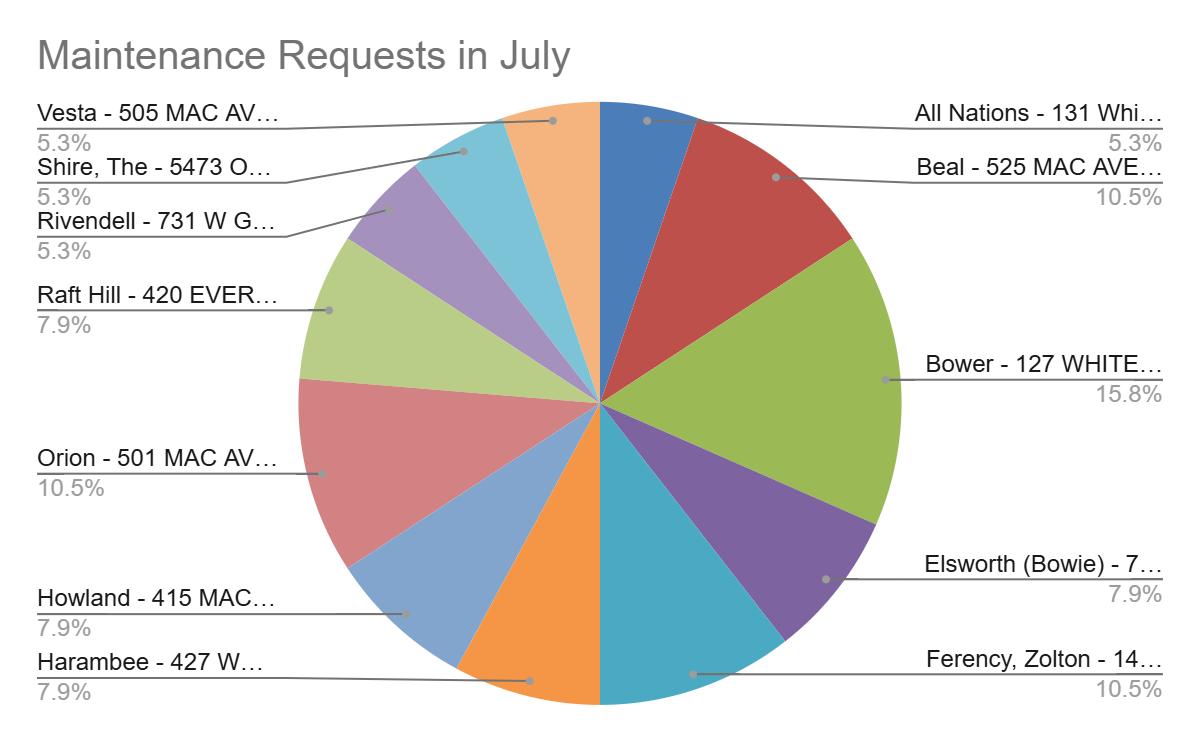 ➔ In July, another 26 maintenance requests were submitted. The house with the most maintenance requests is Bower, taking 15 8% of all requests, with both Beal and Ferency coming right after at 10.5% each. Most maintenance requests included pipe or drain clogs and leaks, garbage disposal issues, and freezer problems.