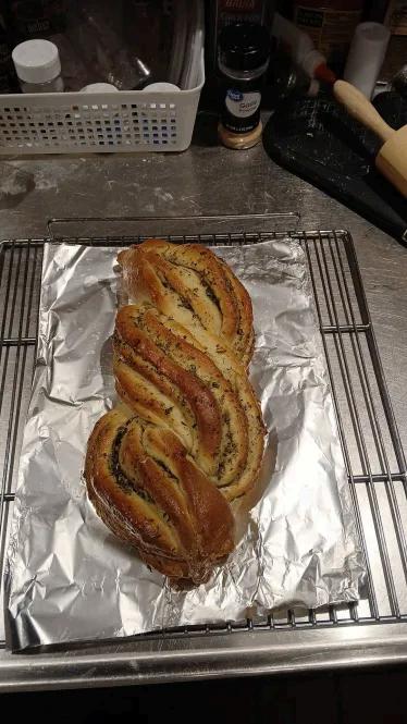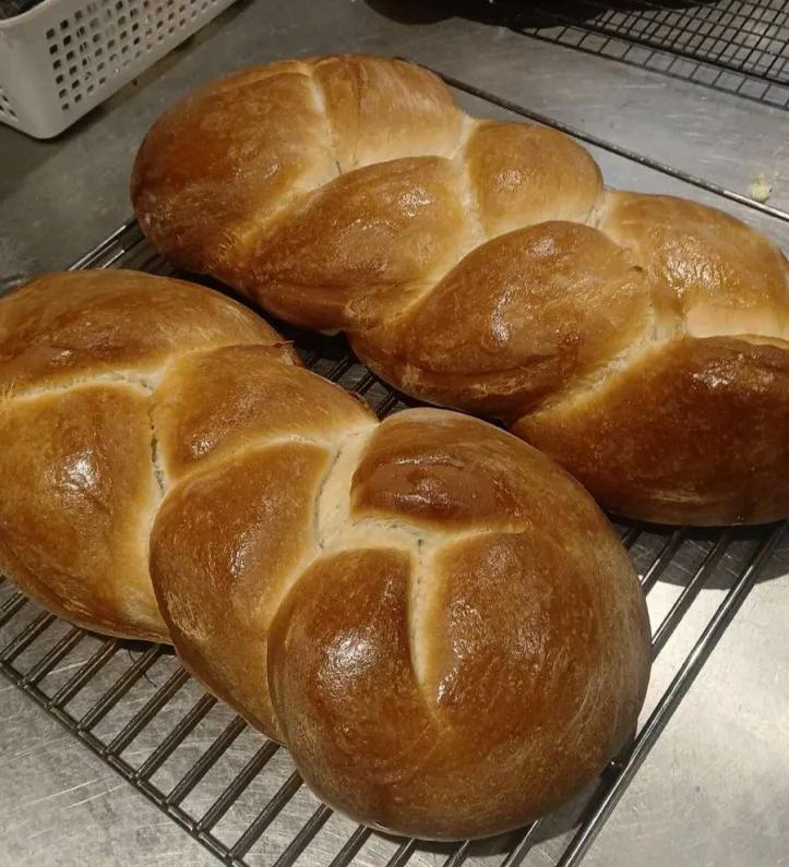 5. Once the dough has at least doubled in size, punch it in the center to release some air. Knead the dough for a couple minutes and divide in half. You can shape into loaves, do a braid, or just set it in a greased 9x5 loaf pan. Allow the dough to rise another 30 minutes, until it is peaking over the edge of the pan a bit or doubled in size. Preheat the oven to 350 degrees F