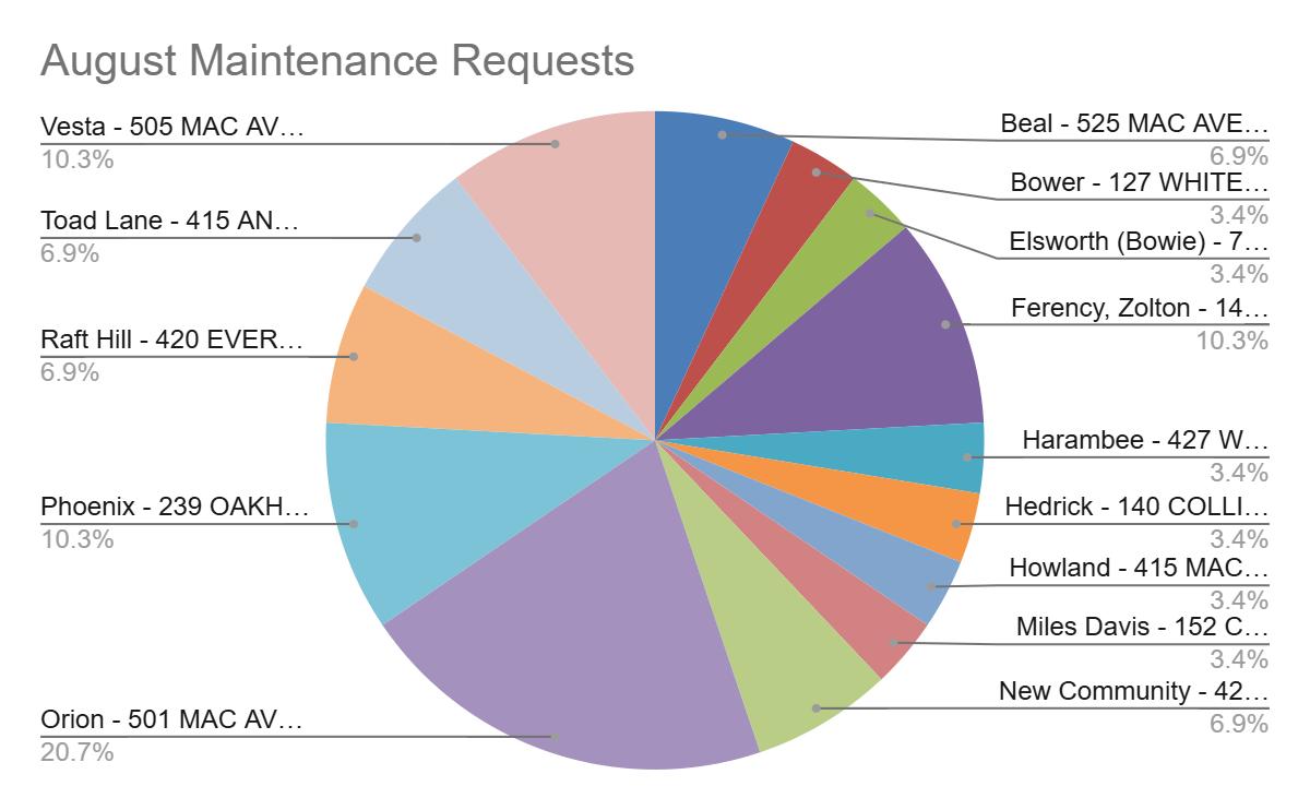◆ In August, Orion had the most maintenance requests, while Vesta and Phoenix followed suit. Most problems were attributed to doors not locking correctly or needing keys; others revolved around the washer and dryers not closing or draining properly.