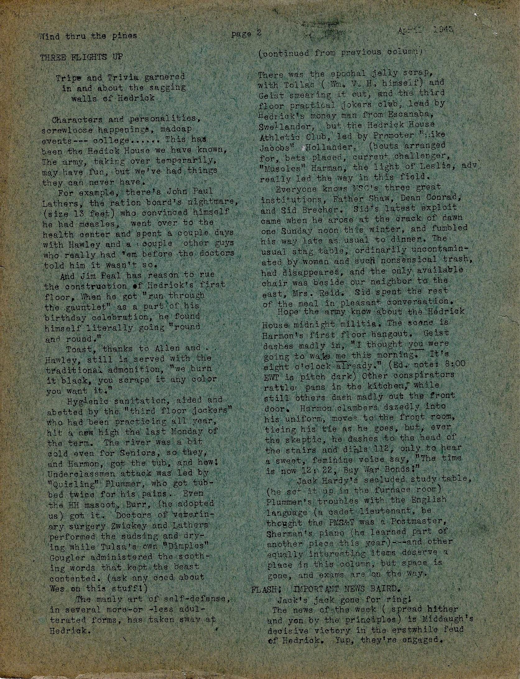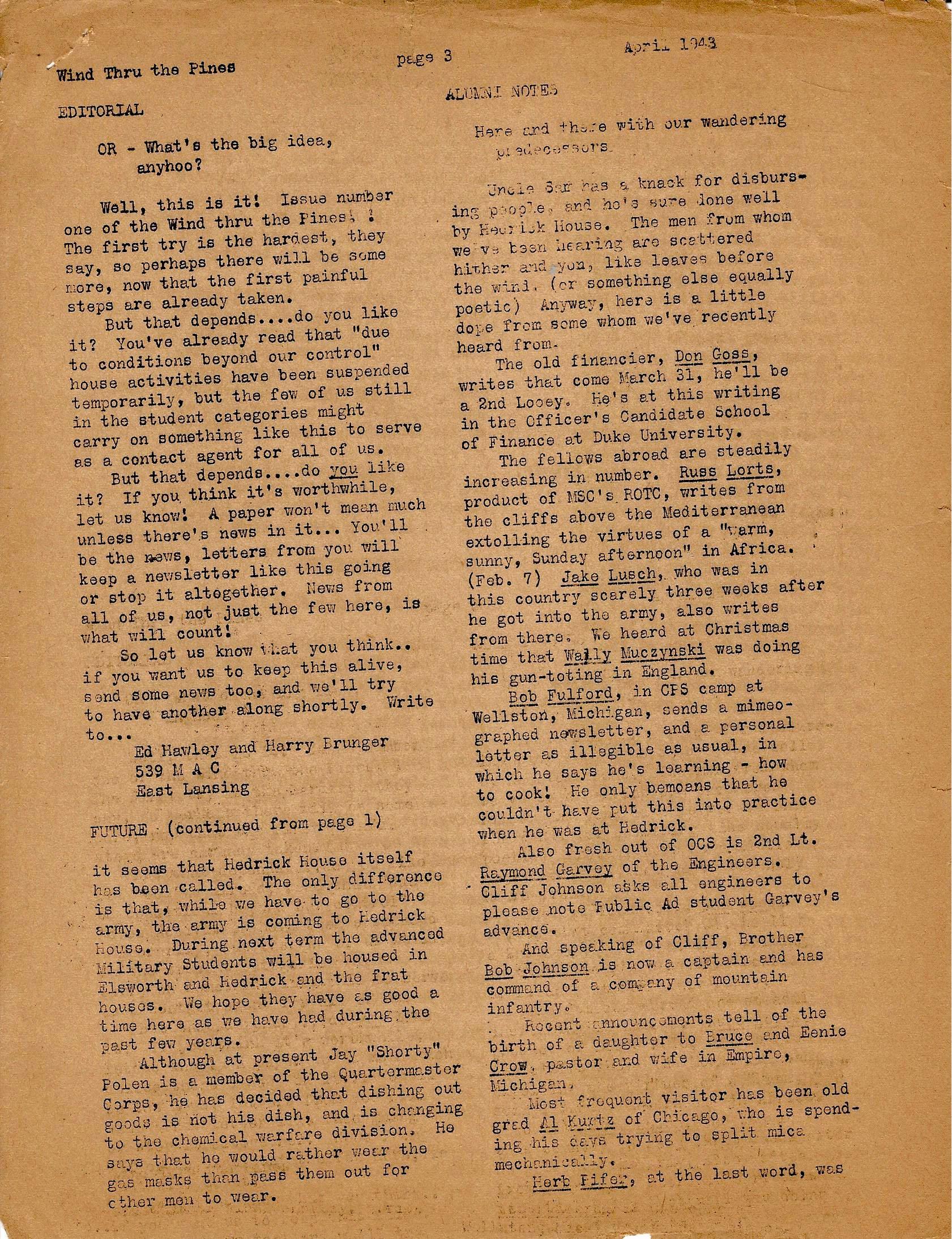 This is the very first issue of Wind Through the Pines, an on-and-off newsletter for the alumni of the SHC. This issue, published in April of 1943, focuses on the impact of WWII on the lives of the men living at Hedrick, and impact on MSU students in general.