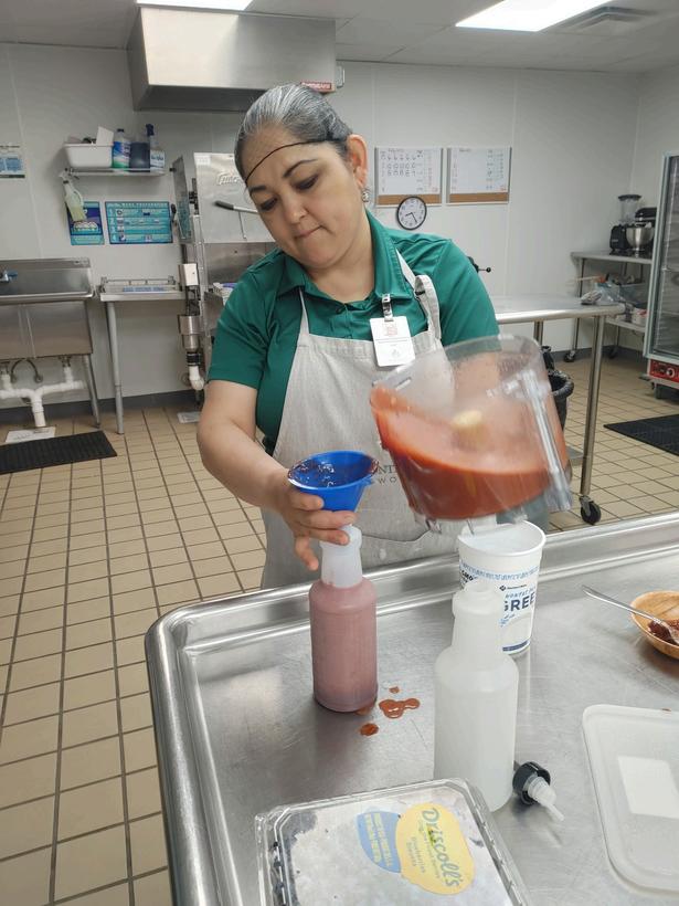 Here is Ms. Maria making fresh syrup and Mr. David shaving the ice for happy students.