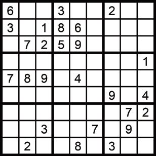 Sudoku: Fill in the grid so every row, every column and every 3x3 box contain the numbers 1-9.