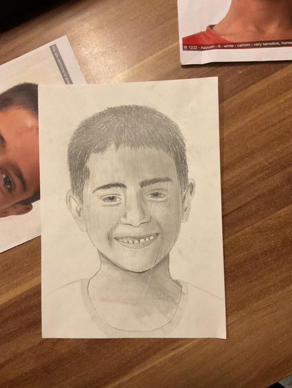 I copied this portrait from an image I had of this child, I don't know much about his story but he is an orphan and I hope that through this portrait I can give him a smile.