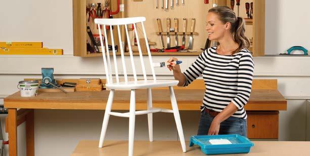 Upcycling heißt der Trend, der Geld spart und Ressourcen schont. Auf die rich�ge Vorbereitung kommt es beim Aufpimpen an: Oberflächen von Stühlen, Türen oder Möbeln sollten gründlich gesäubert und angeschliffen werden. Umso besser ha�et anschließend die neue Lackierung beispielsweise mit der „pep up Renovierfarbe“. Unter www.schoener-wohnen-farbe.com gibt es nützliche Tipps.