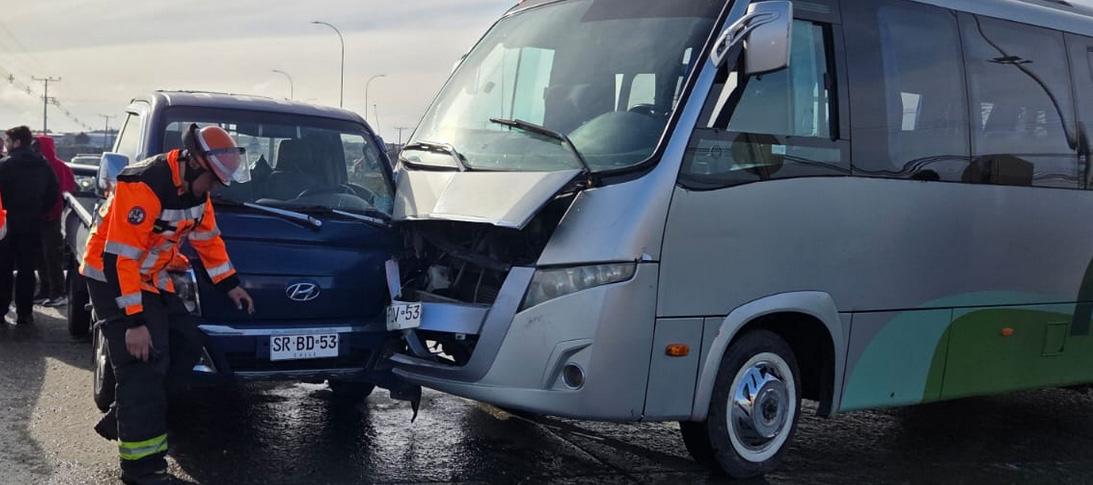 El incidente se produjo durante la tarde de ayer cuando un camión Hyundai porter, que circulaba por Carlos Ibáñez en dirección hacia el centro de Punta Arenas, fue embestido por un microbús que se incorporaba a Avenida Eduardo Frei.