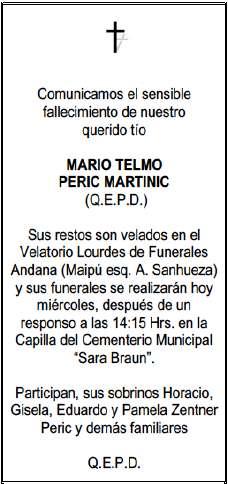 René Orlando Candia Nahuelcar (Q.E.P.D.). Sus restos están siendo velados en el salón velatorio en la Funeraria Corazón de Jesús, ubicada en Armando Sanhueza 556 (al lado club Chile). Sus funerales se realizarán el jueves 11 de diciembre partiendo cortejo a las 14:30 horas a un responso en el santuario María Auxiliadora Don Bosco. Posteriormente se dirigirá hacia el cementerio municipal Sara Braun. Participa: la familia.