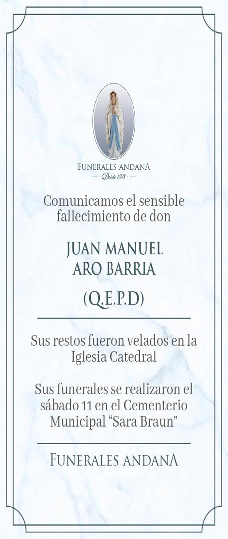 Te recordamos con amor, respeto y paz. No hay palabras que puedan llenar el vacío que nos dejaste, pero si hay muchas que tienen sentido en nuestra memoria como bondad, sabiduría y amor. Hoy celebramos lo que fuiste, lo que sigues y seguirás siendo para nosotros. Como familia los dejamos invitados a una misa de réquiem en Iglesia Catedral, el día lunes 13 de octubre a las 19.00 horas para conmemorar su primer aniversario. Agradece: Su familia.