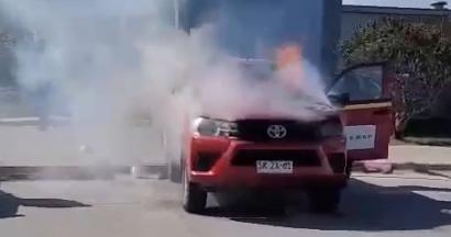 El fuego se originó en el área del motor de una camioneta corporativa de ENAP. Las elocuentes imágenes muestran cómo las llamas se concentraron en la parte delantera del móvil, mientras el ocupante alcanzó a retirar sus pertenencias personales antes de que el fuego se propagara.