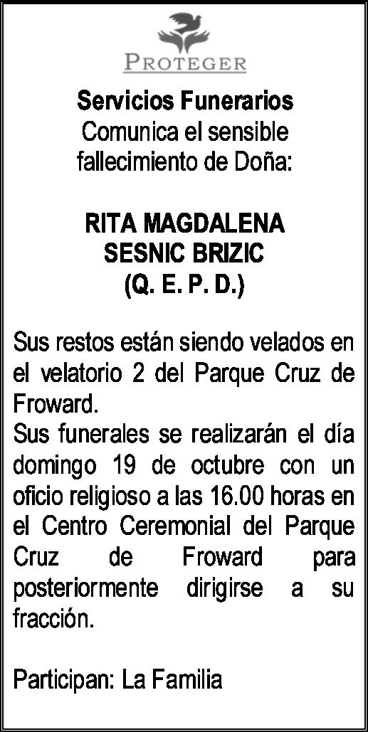 Comunicamos el sensible fallecimiento de la señora Rita Magdalena Sesnic Brizic (Q.E.P.D.). Sus restos son velados en el velatorio N°2 del Parque Cruz de Froward. Sus funerales se realizarán hoy domingo 19, después de un oficio religioso a las 16:00 horas en el Centro Ceremonial. Posteriormente se dirigirá hacia su fracción. Participa: familia Marinovic Solo de Zaldívar.