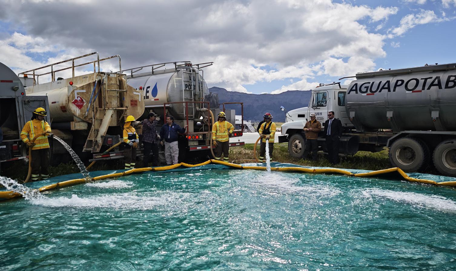 “Estamos dando inicio formal a la instalación de estas piscinas autosoportantes en distintos puntos de la provincia, en este caso en el aeródromo. Son dos piscinas, una de 100 mil y otra de 40 mil litros, que estarán disponibles ante una eventual emergencia”, señaló la autoridad.