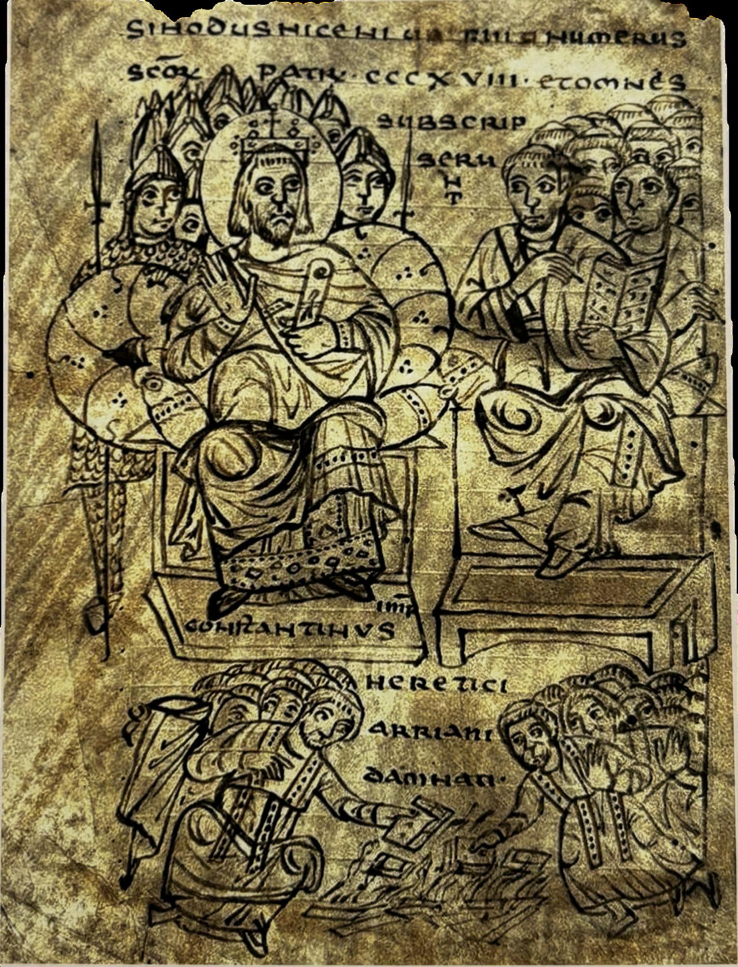 El EmpErador Constantino junto a los obispos dEl ConCilio dE niCEa En un pErgamino CrEado haCia 825. En la partE infErior la dEstruCCión dE los libros quE dEfEndían la doCtrina arriana.
