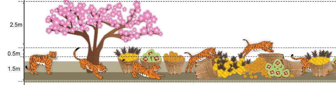 In this rendition of the Lunar New Year, the aim was to be able to express a narrative of regality, family and the community. Given how it was the year of the Tiger, we based the key installations to represent these narratives through a tiger family.