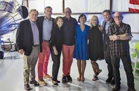 Classmates Barry Stilz, Hampton Adams, Julie Burnett Walker, Steve Schindler, Julie Ireland Myers, Laura Murphy Kehrt, Nicho Nelson, and Wyn Morris gather at Joe Murphy’s hangar to celebrate their shared Big 6-0.