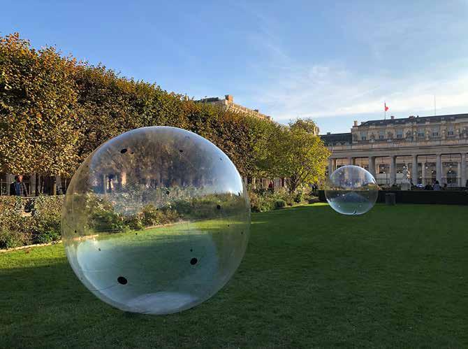 “He takes neutrinos as his starting point, subatomic elementary particles with a neutral charge and very low mass that move at very high speeds through the universe, in the work Neutrino Spheres 3 & 4 (2022). The proposal, specially conceived for the outdoor area of The Hangar in Coconut Grove, focuses on the no tions of immateriality, emptiness, lightness and light, as well as suggesting a metaphorical leap between extreme powers; from the microscopic to the mac rocosmic, from the corporeal to the elusive, from the visible to the invisible. According to the artist, his work proposes a journey “towards the imperceptible, the light, the transparent...”