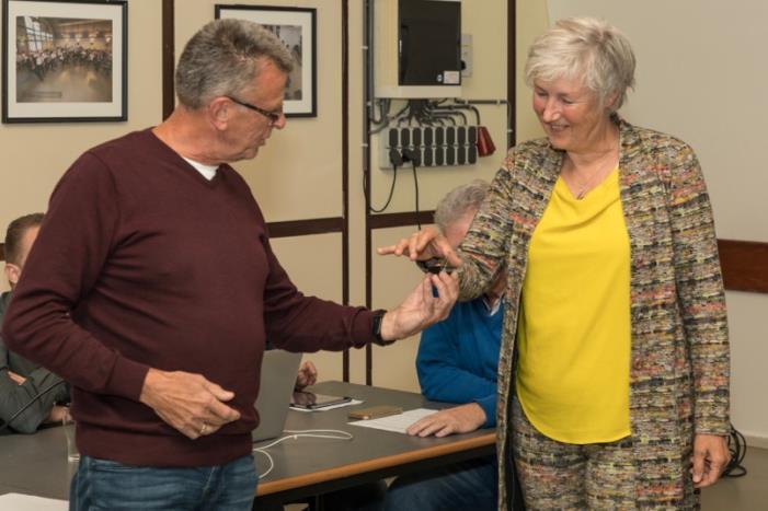 Hoewel Marlies le Grand zo’n twee jaar geleden nog haar 12,5 jaar speldje kreeg, mocht zij vrijdag die van haar 25 jarige jubileum ontvangen. Ze begon met haar zoon bij het toenmalige leerlingoorkest op de altsax, is doorgestroomd naar de Harmonie en speelt daar sinds een paar jaar in het hele hechten tenorsax clubje, die ook geregeld samenkomen om te oefenen. Ook speelt ze nog bij de Gouwe Bigband en zet ze zich vaak in voor de Jantje beton actie.