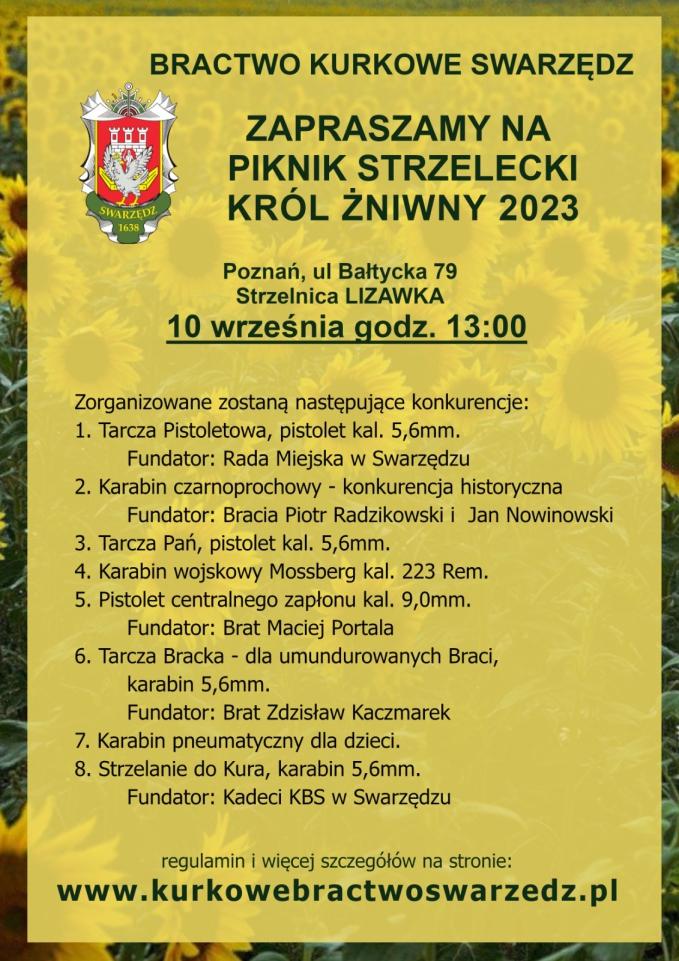 10 września 2023, na Strzelnicy Lizawka, odbędzie się piknik strzeleckiBractwaKurkowegoSwarzędzKrólŻniwny2023.