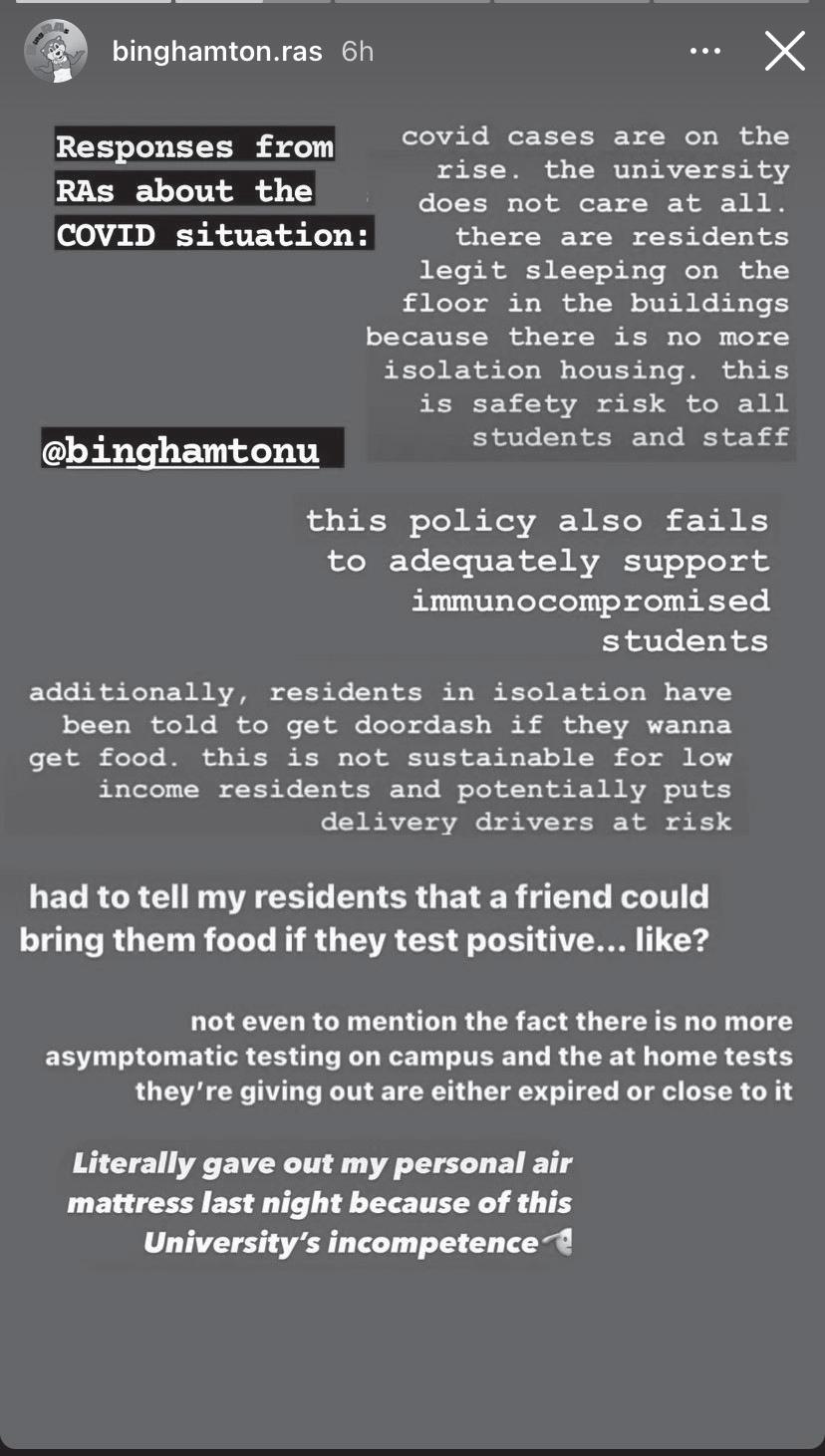 According to @binghamton. ras, due to the limited isolation housing at BU this semester, RAs have reported residents sleeping in building hallways, putting themselves and others at risk. The University’s fall 2022 guidance plan mentions that, should students be unable to find room in isolation housing, they should consider staying home or remaining in their dorms. We encourage the University to support students who are only able to choose the latter. We condemn the University for not being better prepared and failing to properly