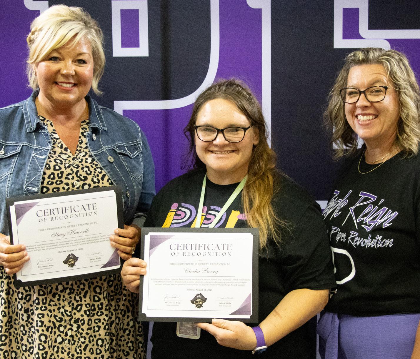 For this outstanding contribution, Stacy and Cierha were honored as August Certified Purple Reign Award winners at the Board of Education meeting, a recognition that celebrates their commitment to innovation and the Piper spirit.