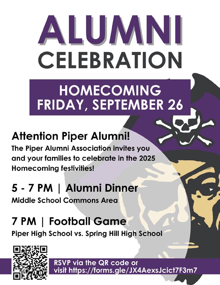 Piper Alumni – we want to see you back on campus! The Piper Alumni Association invites you and your families to join us for a special evening of Homecoming festivities on Friday, September 26. Kick off the night with the Alumni Dinner from 5–7 PM in the Middle School Commons, then cheer on the Pirates as Piper High School takes on Spring Hill High School under the lights at 7 PM. Don’t miss this chance to reconnect with old friends, celebrate our Pirate pride, and make new memories with the Piper community.