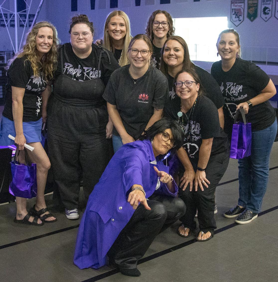 Dr. Jessica Dain (aka Prince for the day) celebrates with staff from Piper Creek Elementary at the staff kick-off celebration this August, formerly known as Convocation.