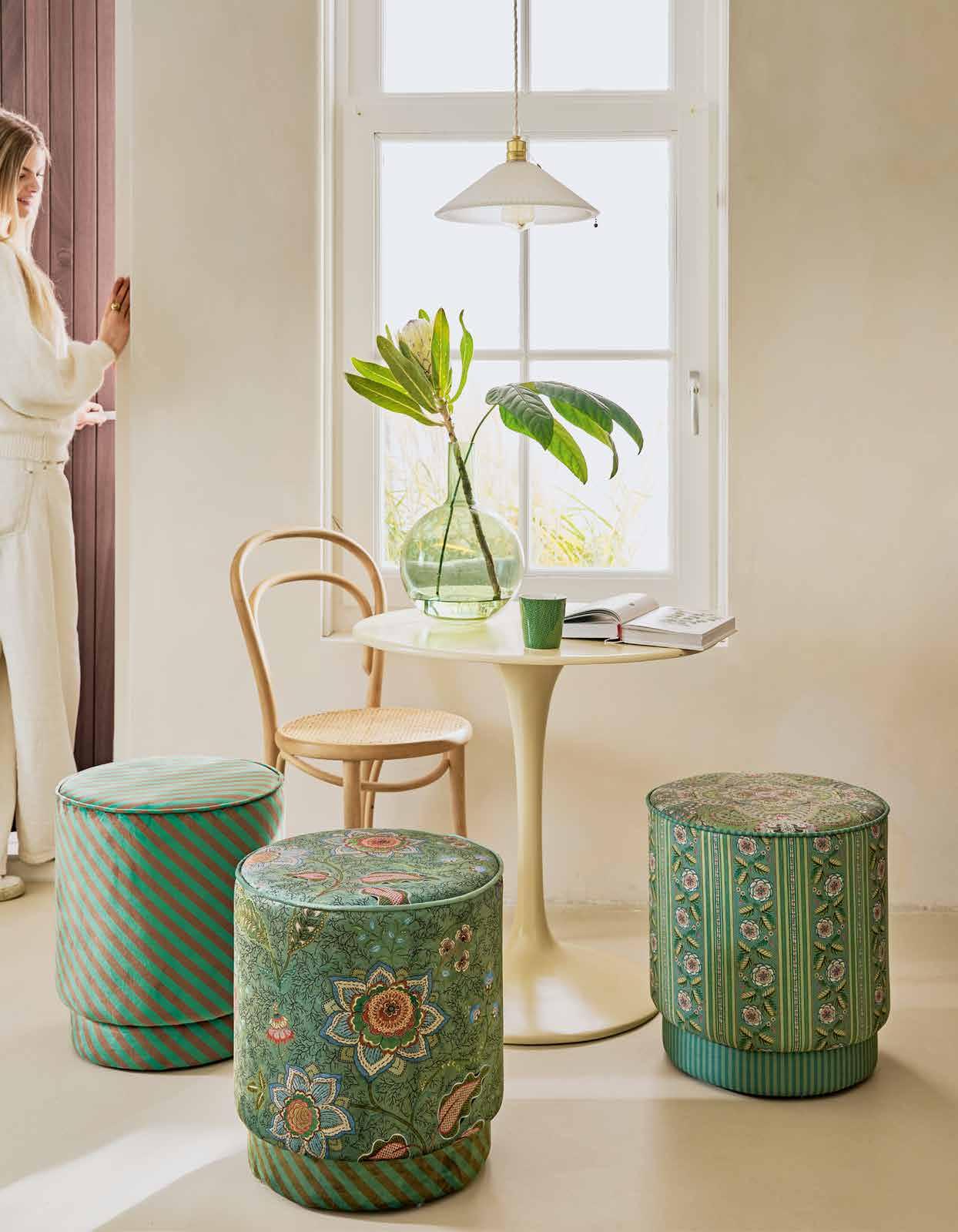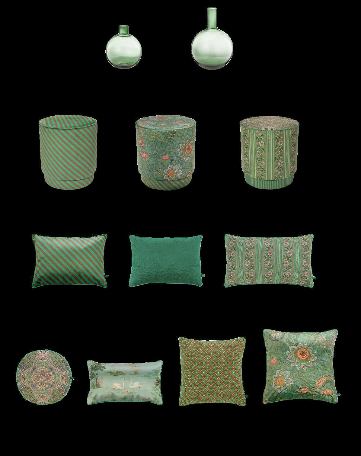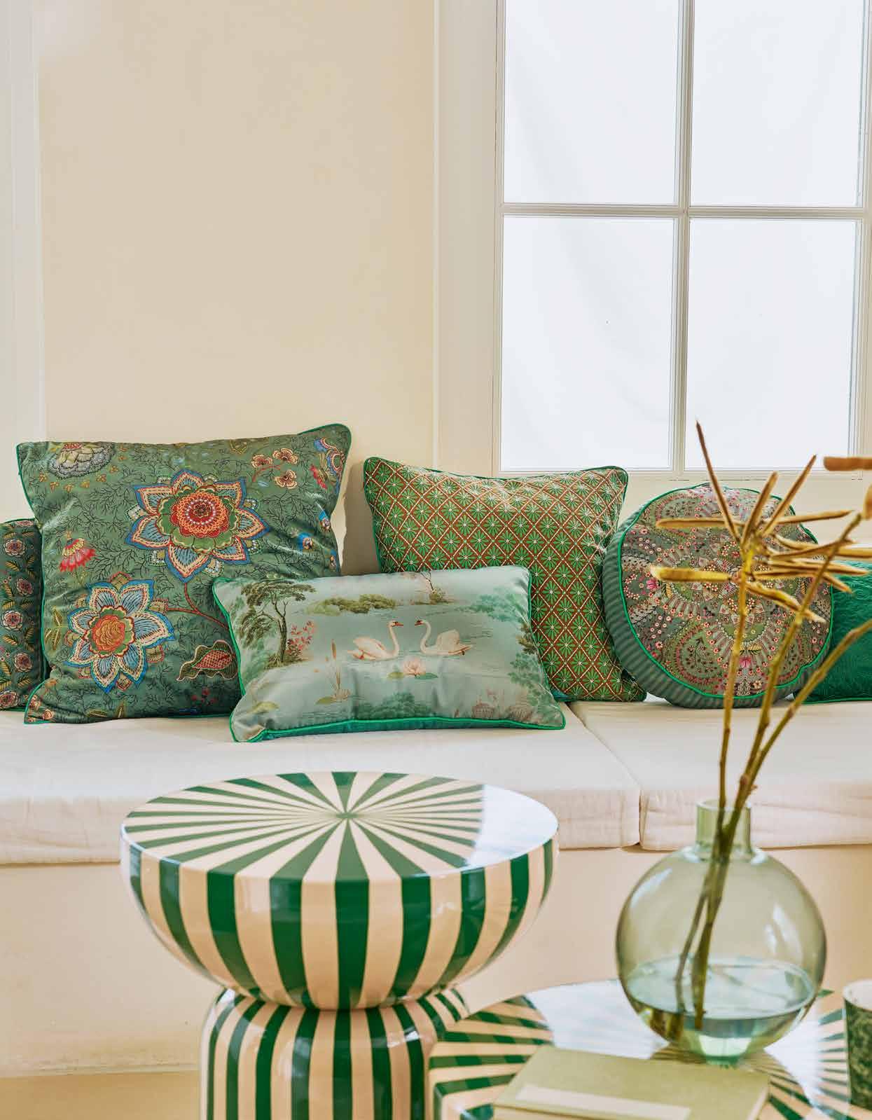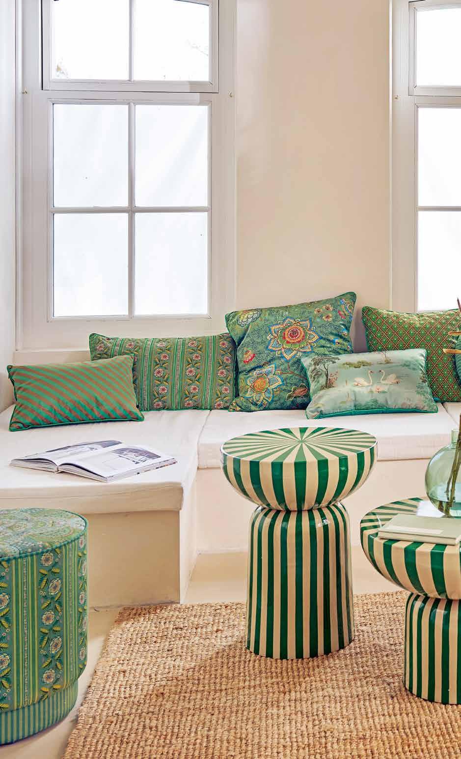 The various shades of green perfectly complement the natural design. Adding stripes gives the collection an unexpected touch, making it perfectly suited to modern interiors.