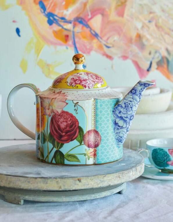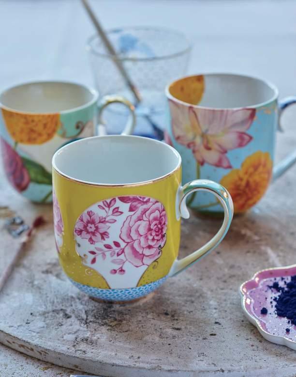 The Royal Multi collection is inspired by historic tableware. We used bold vintage flowers and blue blossoms to decorate the colourful cups, plates and bowls.