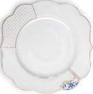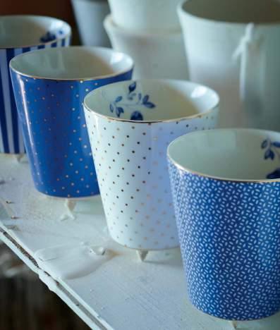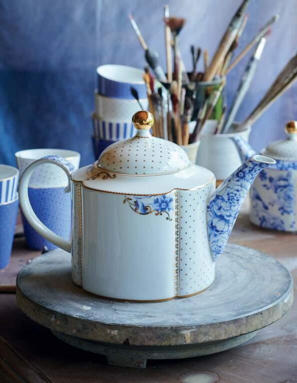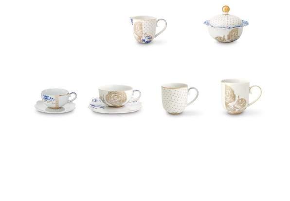 The Royal White tableware has been designed with a nod to Pips Dutch origin. The crispy white items are decorated with hand painted Delft Blue flowers. The graphic golden curls and dots give the collection a modern twist.