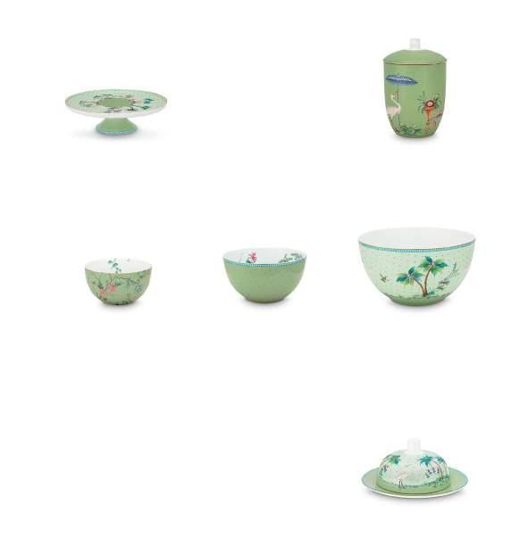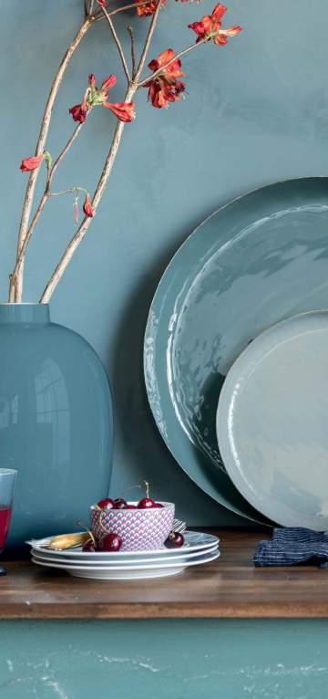 We added a subtle green edition to the Jolie collection, that combines perfectly with the existing blue Jolie tableware. The unique layout of the placed decoration on the round pieces makes it an exciting view from every side.