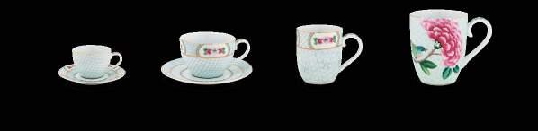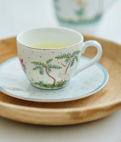 The cups have been decorated with floral ornaments, inspired by the wooden Indian arches. In some items the flowers are combined with the refined Seigaiha wavelets print, which is typical Japanese. Every piece is decorated with golden details, a real treasure on your table.