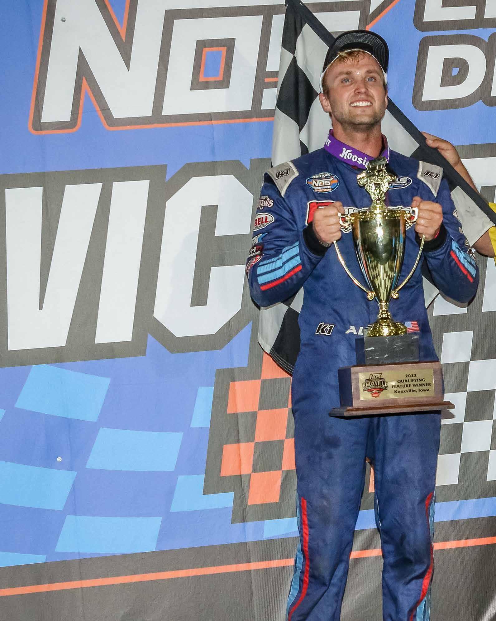 Jacob Allen realized a dream by adding his name to the winner’s list at Knoxville Raceway on Night #2 of the 61st Knoxville Nationals. The win was worth $12,000 to the Hanover, Pennsylvania resident and came aboard the Shark Racing #1a. Jacob joined his teammate, and nephew Logan Schuchart, and his father Bobby as a Knoxville win ner. Austin McCarl emerged as the high point man, and earned the pole for Saturday’s finale.