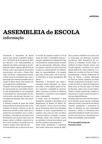 mas e prémios simbólicos aos alunos que se destacaram nas diferentes vertentes (excelência, valor, desportivo). As cerimónias já realizadas tiveram lugar no Auditório do Ramo Grande, sempre com lotação esgotada e contaram com o apoio imprescindível de várias empresas e entidades do concelho da Praia da Vitória, nomeadamente a Escola Profissional da Praia da Vitória, a Câmara Municipal da Praia da Vitória, Auditório do Ramo Grande, Academia da Juventude e, em novembro de 2013, as Juntas de Freguesia de Santa Cruz, da Vila das Lajes e da Fonte do Bastardo, assim como as lojas Expert, Rústica e Ângelo Amaral Lda., também se associaram ao evento através dos patrocínios que disponibilizaram. Perspetivando uma visão educativa baseada no trinómio acesso-sucesso-realização (pessoal e social), acrescido de um esforço conjunto, participado e responsável de todos os membros de uma comunidade educativa, o mérito e a excelência serão expressões dotadas de sentido e de conteúdo para uma Escola que, diariamente, trabalha com qualidade e pela qualidade. Pl’ A Assembleia de Escola Francisco Costa