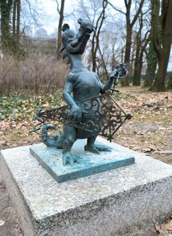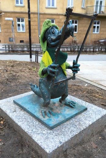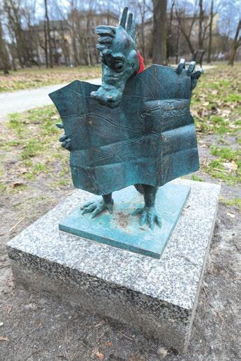 Smoki centralne Po wejściu do parku możesz skierować się w stronę kolejnej figurki – Smoka Wodnego. Tym razem czeka Cię dłuższa, około półgodzinna wyprawa. Podążaj w kierunku altanki – doprowadzi Cię ona do wyjścia od strony placu Niepodległości. Idąc cały czas prosto, dotrzesz do mostu Piłsudskiego, którym dostaniesz się na drugi brzeg Wisły. Idź dalej wzdłuż rzeki, biorąc azymut na Wawel. Z nadwiślańskich bulwarów przenieś się na Powiśle, kierując się w stronę hotelu Sheraton. Cel Twojej wędrówki znajduje się między hotelem a parkingiem, przy placu Na Groblach. Smoka Wodnego zastaniesz podczas kąpieli połączonej z obiadem. Jego obecność w tym miejscu jest nieprzypadkowa – dawniej na