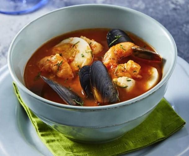 LavalosmariscosCortaelpescadoentrozos medianosyretiralacáscaradelos camaronesCortaelpulpoentrocitosyañade todoslosmariscosalcaldo,revuelve ocasionalmente