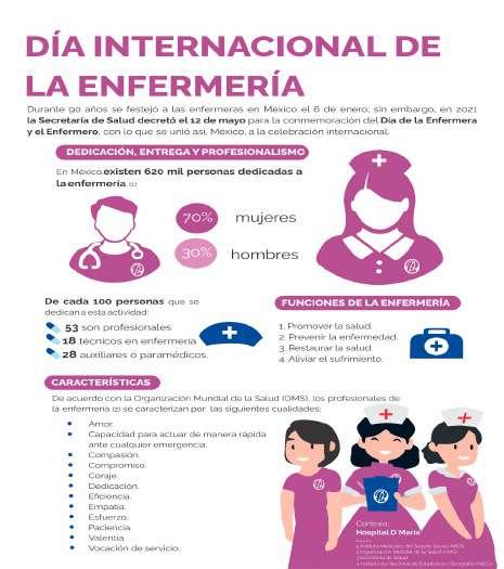 Elpersonaldeenfermeríasonseresquebrindanconsuelo,atención,reconfortan,iluminanlos díasdevariosenfermos,sostienenunamanocuandolonecesitaneinclusosecanalgunas lágrimas,brindanpalabrasdealientoyenocasionesentablanunlazodeempatía,conelpaciente ylafamiliaPorello,estedíasereconoceatodoslosenfermerosyenfermerasdeMéxicoyel mundoquerealizanestaloablelaborenfavordetodalahumanidad