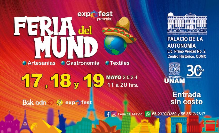 EXPOFESTuneesfuerzosconlaFundaciónUNAMyextendienunainvitaciónalpúblicoparaasistirdel17 al19deMayode11a20Horas,alaFERIADELMUNDOenelPALACIODELAAUTONOMÍADELA FUNDACIÓNUNAM,unbellorecintoubicadoencalleLicPrimoDeVerdadNo2esqconMoneda,CP 06060,CentroHistórico,CDMX,dondemilesdepersonaspodrándisfrutardurantetresdíasdeuna increíblefiestaintercultural,teniendoagranpartedelmundoreunidoenunsololugarUnEVENTO GRATUITOenelqueademásdeobservarlascostumbresdedecenasdepaíses,losasistentespodrán deleitarseconlagastronomíainternacionaldeestasnaciones,apreciaryadquirirsusartesanías,textiles, joyería,cosméticosycientosdeproductosdecorativos