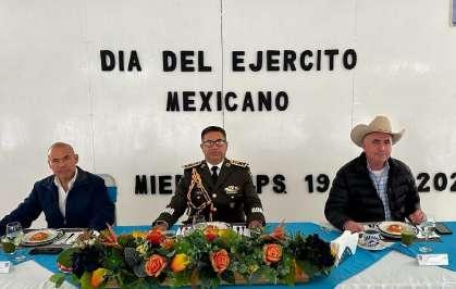 E n la celebración del Día del Ejército Mexicano, que fue encabezada en el Cuartel Militar de Mier por el Coronel Julio César Téllez López, Comandante del 25/o. Regimiento de Caballería Motorizado, el Alcalde Biol. Ramiro Cortez Barrera refrendó el reconocimiento del Pueblo y Gobierno de Miguel Alemán a todo el personal militar que ha contribuído de manera conjunta a mejorar las condiciones de seguridad y a construir la paz que todas las familias demandan y merecen. El Presidente Municipal asistió a la celebración acompañado de