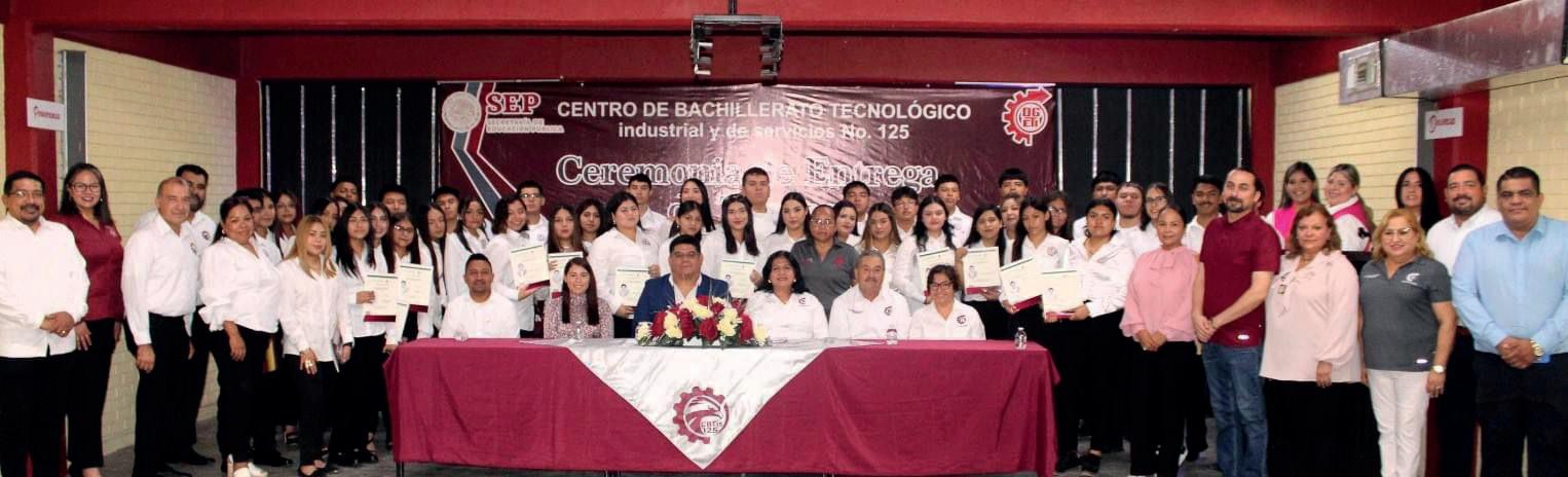 M ediante una conmemorativa ceremonia los alumnos de la generación 2020-2023 del Centro de Bachillerato Tecnológico Industrial y de Servicios (CBTIS 125) recibieron sus títulos de Técnicos, egresados de esta institución educativa. La Directora del CBTis 125 reconoció a las autoridades municipales y educativas que asistieron. Estuvieron premieres el Lic. Ricardo Hernández Rocha, Presidente Municipal. La Dra. Andrea Cortez Aguirre, Presidenta del Sistema DIF. El Ing. Erick Adrian Guerra Canales, Director de la Misma Institución. Joel Eliud Araguz Loredo, titular del CREDE y el Prof Jesús Andrade. Al finalizar la entrega de los títulos, el alcalde, Lic Ricardo Hernández Rocha les tomó protesta a quienes egresan de esta casa de estudios.