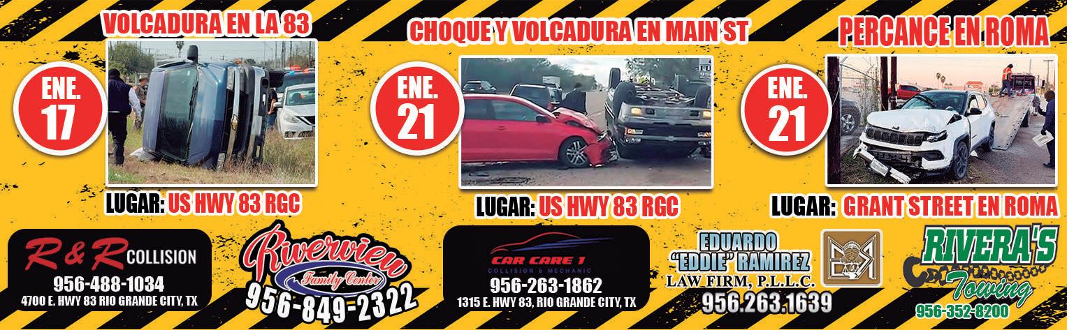 U n accidente de tránsito ocurrido la tarde del martes 21 de enero, dejó como saldo importantes daños materiales, aunque afortunadamente no se reportaron personas lesionadas. El incidente ocurrió en la US Highway 83, frente a la tienda de muebles J&J Furniture, en la ciudad de Río Grande, cuando un vehículo Volkswagen Jetta de color rojo colisionó violentamente contra una camioneta Pickup Chevy Silverado. El fuerte impacto causó que la camioneta Silverado se volcara de manera aparatosa, quedando completamente volteada sobre el estacionamiento de la mueblería, con las llantas hacia arriba. Por su parte, el Jetta quedó atravesado en uno de los carriles de la carretera 83, en dirección norte, obstruyendo parcialmente el tráfico. Testigos del accidente reportaron que no hubo personas heridas, aunque el impacto fue lo suficientemente fuerte como para que ambos vehículos sufrieran daños severos. Al parecer ambos vehículos